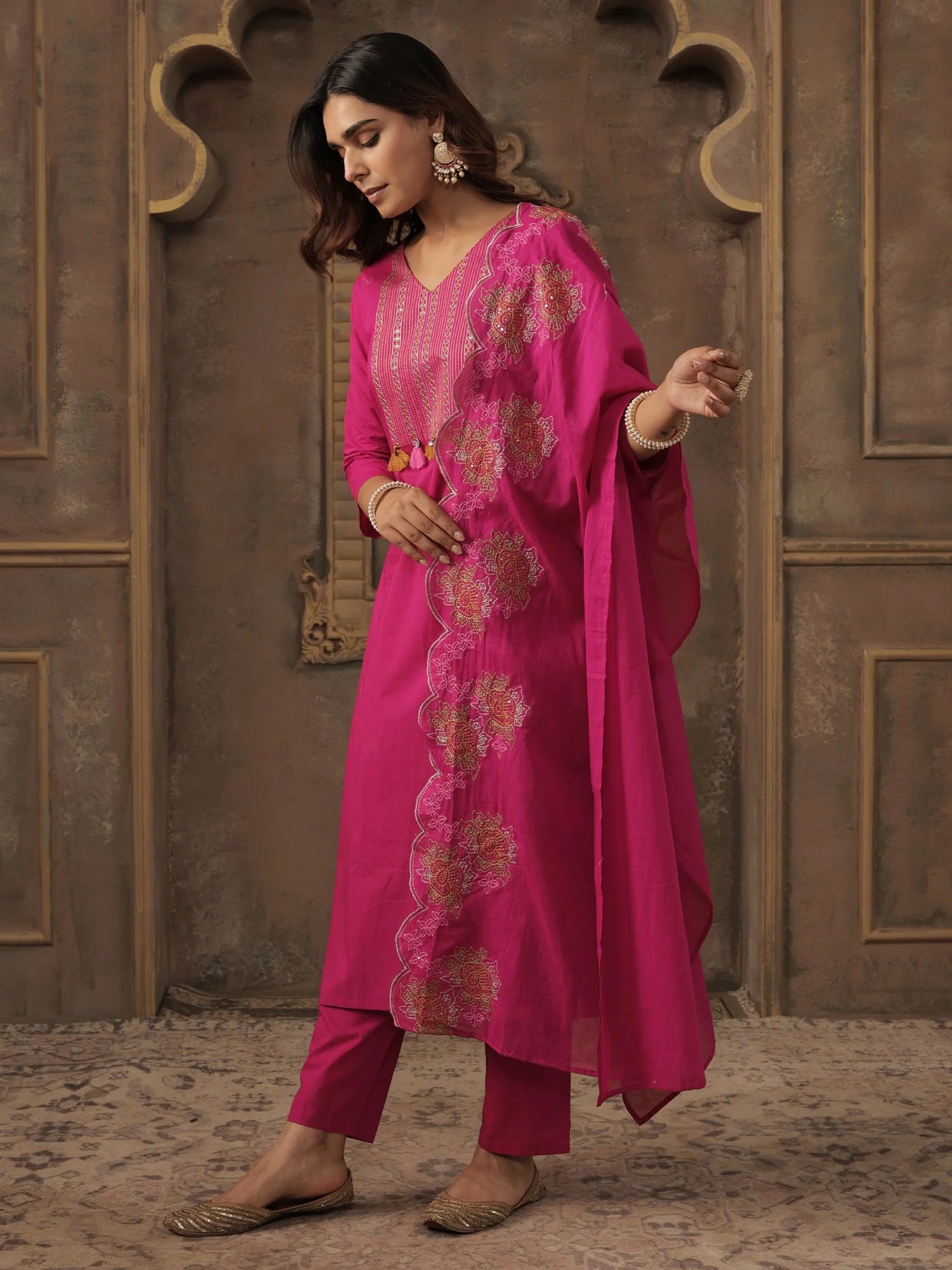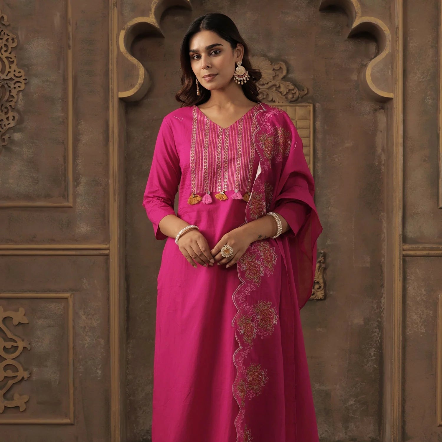 This elegant pink kurta set includes a comfortable kurta, matching trousers, and a stylish dupatta. Crafted from high-quality fabric, it ensures a soft touch and lasting durability. Perfectly tailored for a graceful silhouette, this set balances traditional charm with everyday comfort. Ideal for both casual and festive occasions, it offers ease of wear without compromising on style.